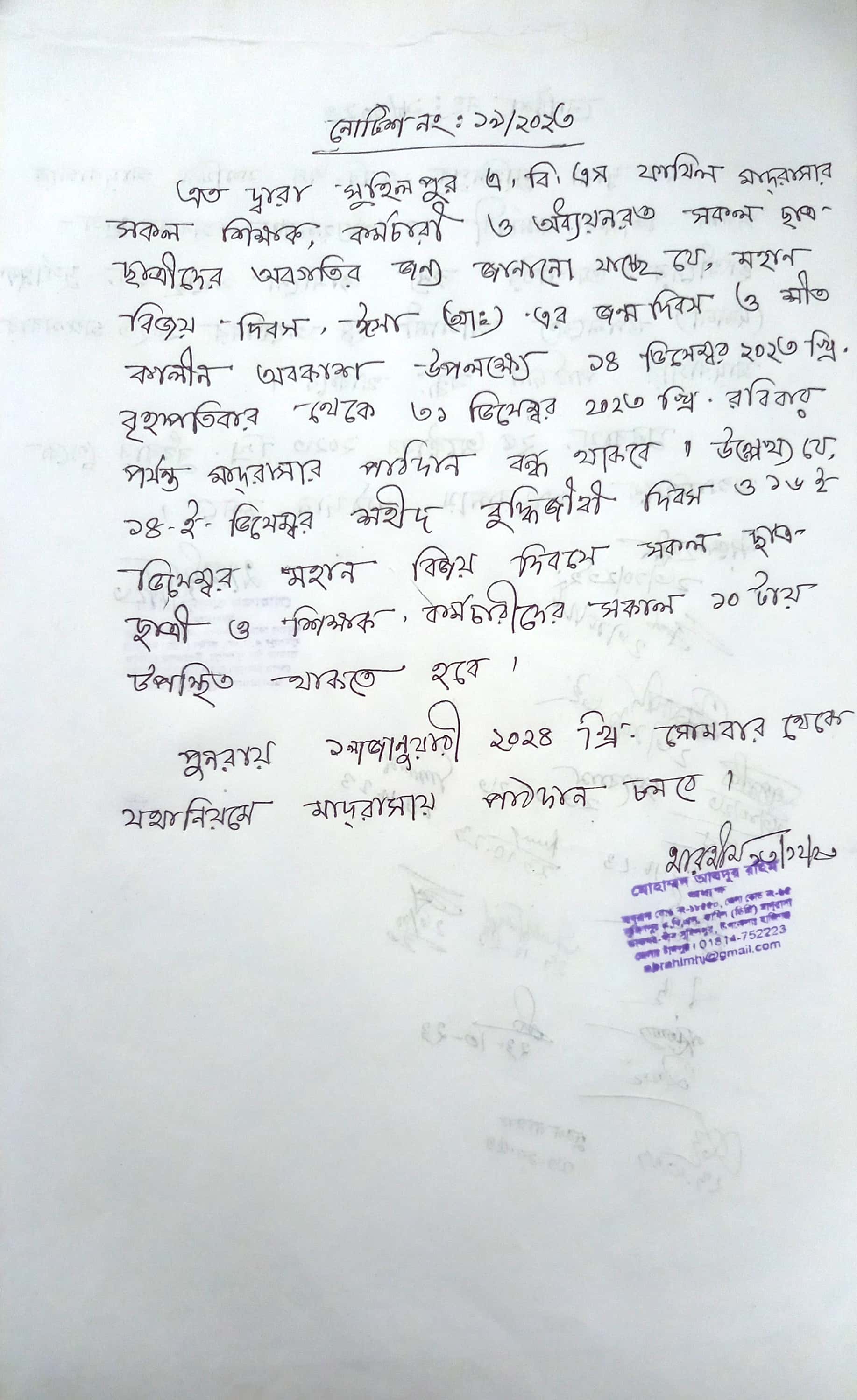 শহীদ বুদ্ধিজীবি দিবস,বিজয় দিবস উদযাপন ও শীতকালীন ছুটি বিষয়ে নোটিশ
